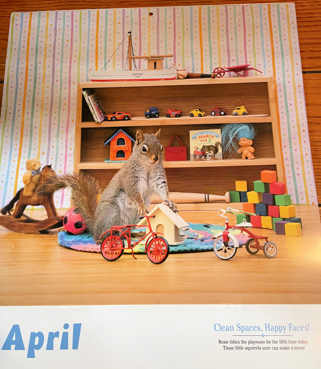 This is not a calendar about squirrels climbing trees or gathering nuts in nature. This calendar features bright, colorful pictures of squirrel having picnics and playing with toys.