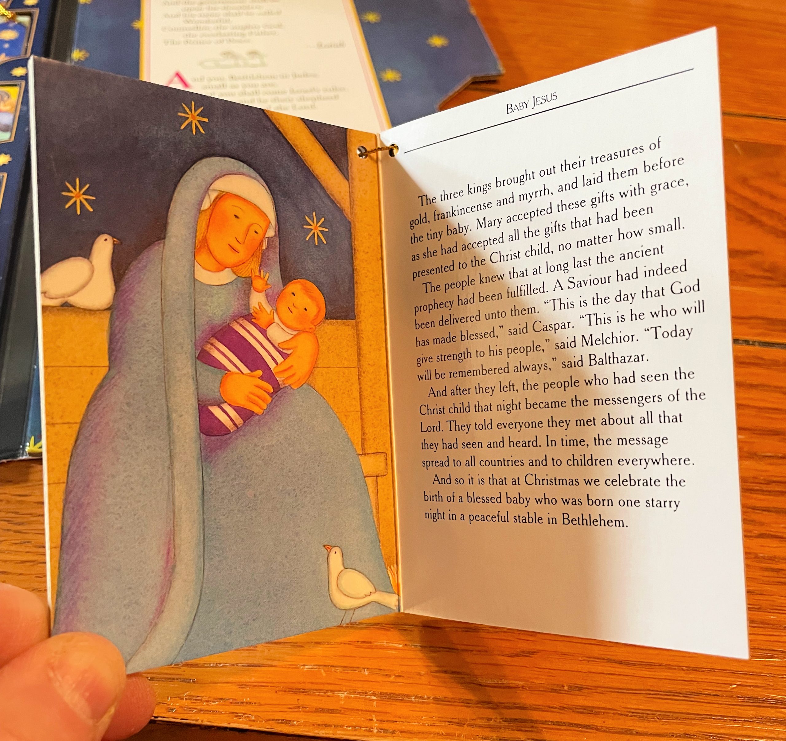 The books are numbered, because you are suppose to read them in order up until Christmas Eve. The last book is larger than the others, and is about the birth of baby Jesus.