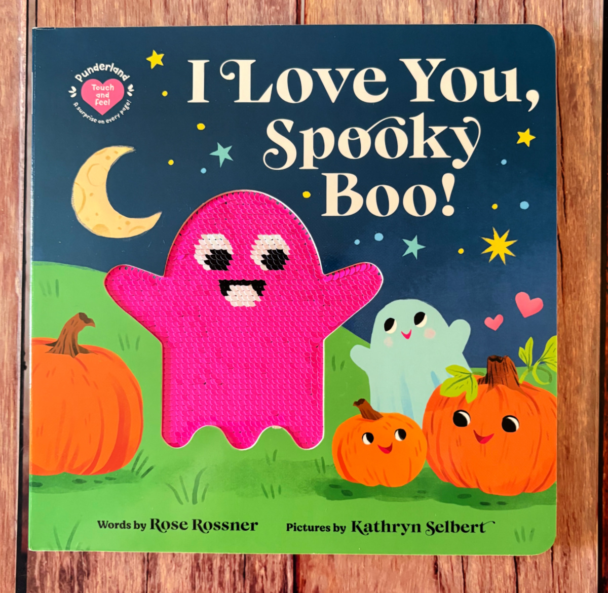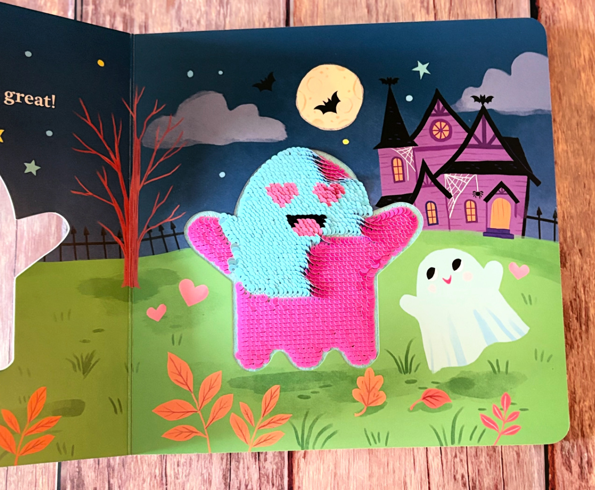This is a charming book for little ones that features a lot of cool things they can touch and feel, staring with the color changing sequined ghost on the front cover/first page.