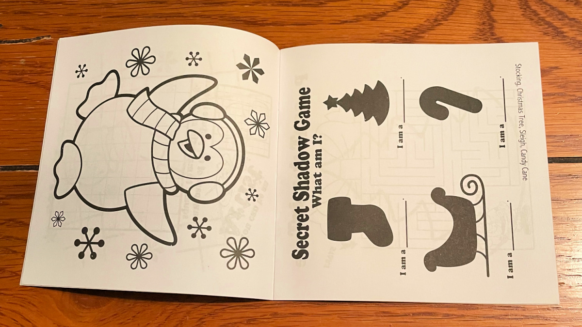 Inside the box there was a holiday treat bag with an adorable illustrated mouse “topper.” Inside the bag there was a coloring/activity book, a Christmas pencil and a cute snowman stacking pencil.