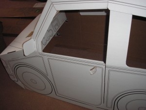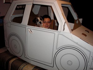 As you can see the car is not decorated like the above picture. The car is left blank so that your child can decorate it and color it any way they want. With the exception of things written on the dashboard my son hasn’t decorated it yet. He wrote in a radio station and a few other things. I joked with him that I was going to make an air freshener out of cardboard too.