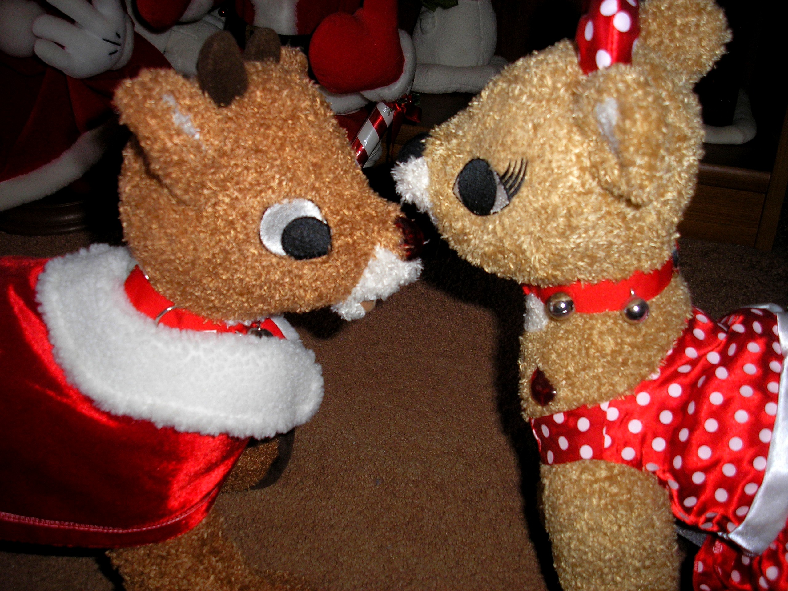 We dressed Rudolph in a cape and gave him a collar with jingle bells on it. Clarice is wearing a darling red dress with white polka dots and the same jingle bell collar that Rudolph has. Clarice comes with the cute bow on her head.