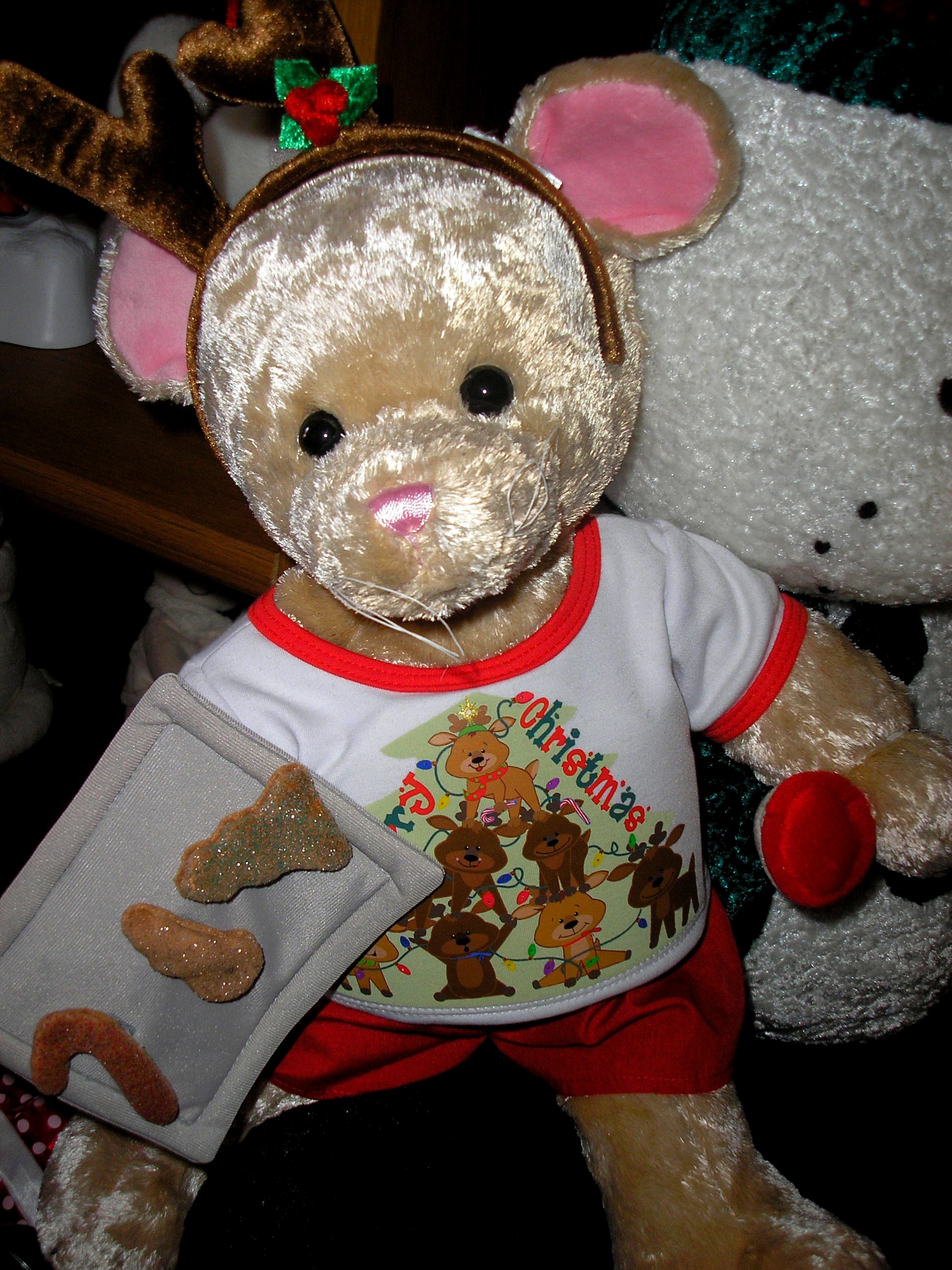 We also picked up a cute little mouse on clearance for only $7.00. My husband things he’s kind of creepy with his long pink tail. I picked up an antler headband with a jingle bell on it, shorts and a Christmas shirt that actually lights up when you press the button. Now the little mouse is all dressed for the holiday season too. To make him even more festive I picked up some baking accessories including holiday cookies.