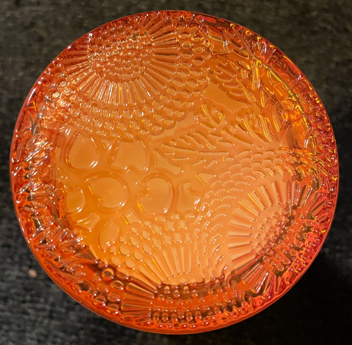 The candle comes in a beautiful glass jar with a matching glass lid. The glass has a pretty design all over it. Inside you’ll find a candle with white wax. IT SMELLS SO GOOD! I’m intoxicated by the scent. I have it on my desk as I am typing this with the lid off and I can smell it, even though it’s not lit.