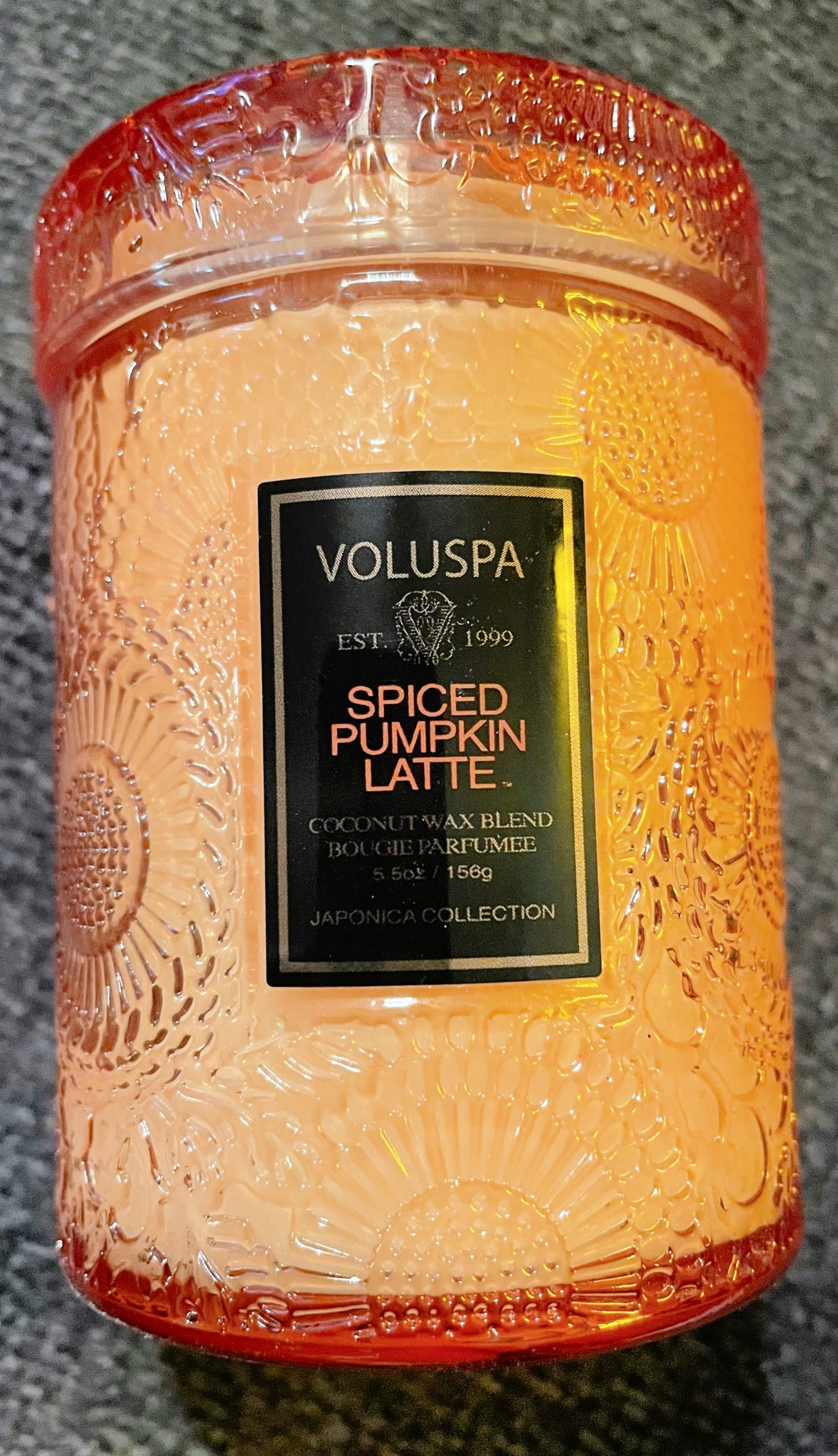 The candle is made by Voluspa and the scent is spiced pumpkin latte.
