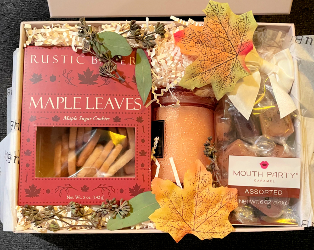Inside the box I found a box of Maple Leaves maple butter cookies, a candle and a package of artisan handmade sea salt caramels.