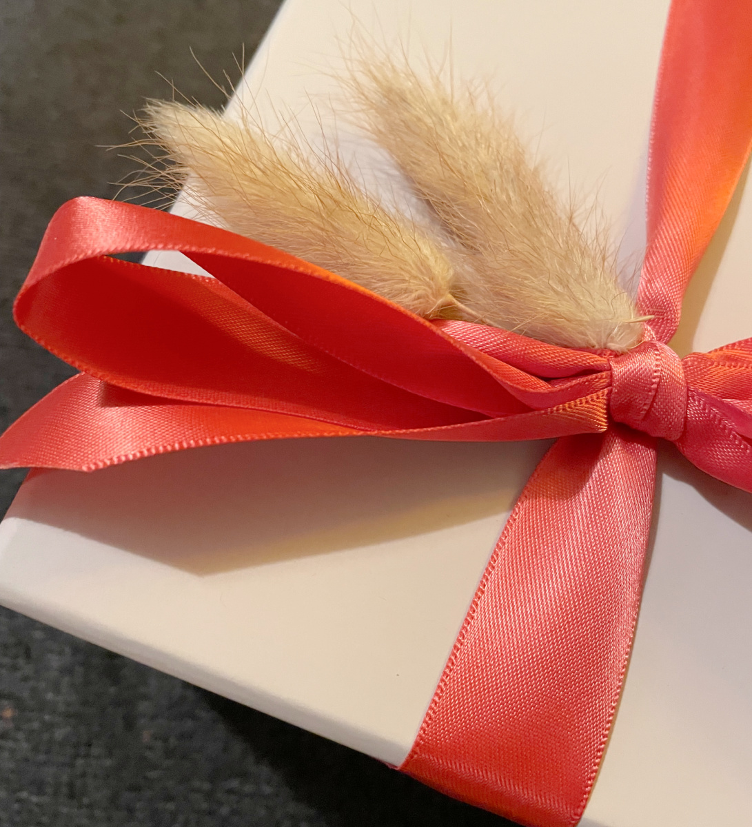 The box came beautifully packaged. I was surprised at how lovely it looked with just a simple red ribbon that was accented with some beautiful “fluffy” fall plants. For the life of me I cannot remember what they are called! I know I have seen them around. They are not “cat tails,” but something similar… but fluffy (if you know what they are called, please comment and let me know because it’s driving me crazy!).