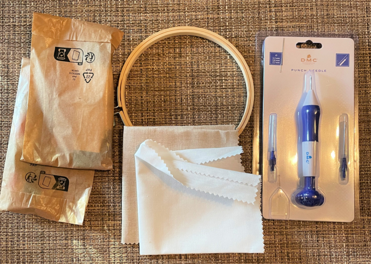 To be honest, I have been wanting to try doing punch embroidery. It looks easy (and fun) to do. You literally put the punch needle (pictured above to the right), and push the tip into the fabric and pull it back out. That’s it. There is no in/out movement. It’s much easier for my Carpal Tunnel hands/wrists to do. I’m sure it would be a lot easier for someone who suffers from arthritis or another type of ailment to do.
