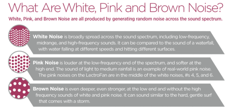 There is a fascinating section on the LectroFan website that teaches you more about the different “color” sounds. You can find that page here – White, Pink, and Brown Noise: What’s the Difference?