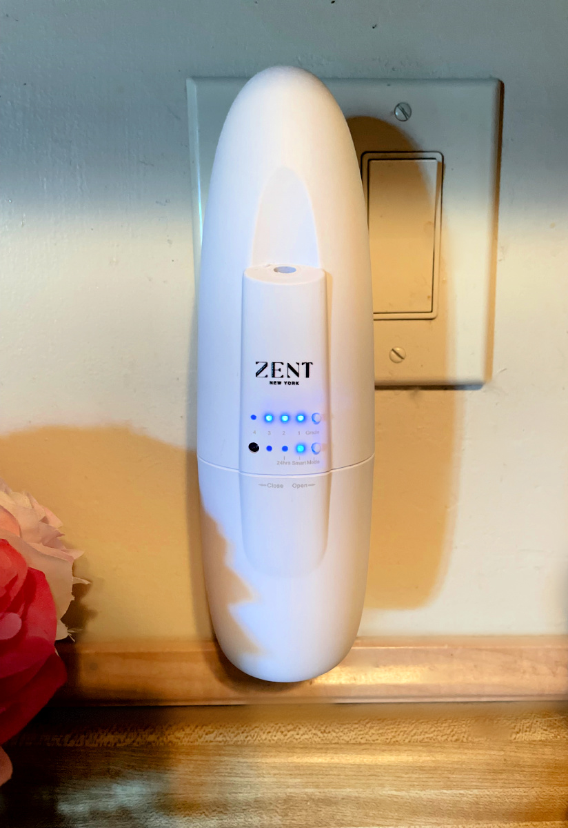 The interesting thing about this diffuser is that when you plug it in, a light mist emits from it. That is what is carrying the scent. It’s not like a diffuser where the unit heats up which causes the scent to be released. Zent New York’s diffuser uses a steam which helps the scent to float in the air a lot quicker and more efficiently.