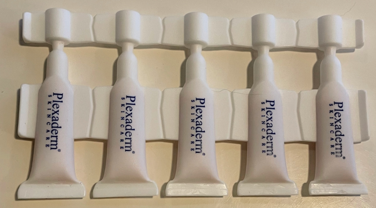 Plexaderm comes in tiny white vials. I thought it was in a single tube. I was almost disappointment when I when I first opened the box because I thought I could only use the product a handful of times before all the vials were used up, when it fact each little vial contains enough Plexaderm for 2-3 applications. So each box would last about a month if you used it daily, and was able to get three uses out of each vial (they are resealable after each use).